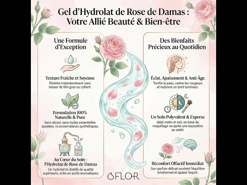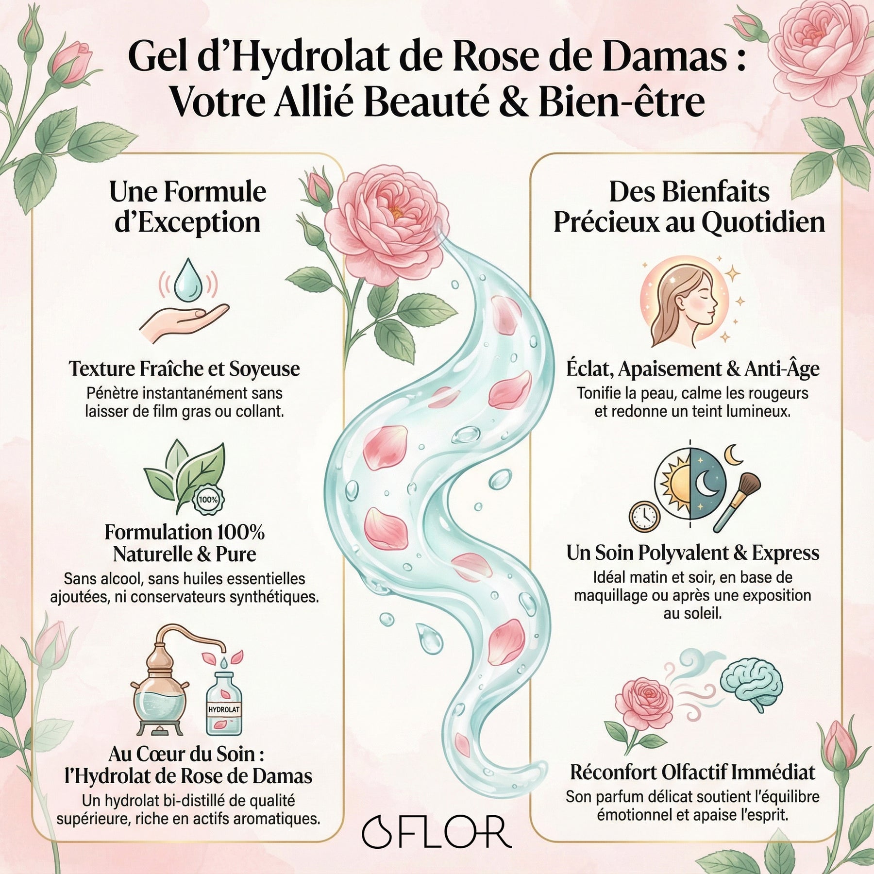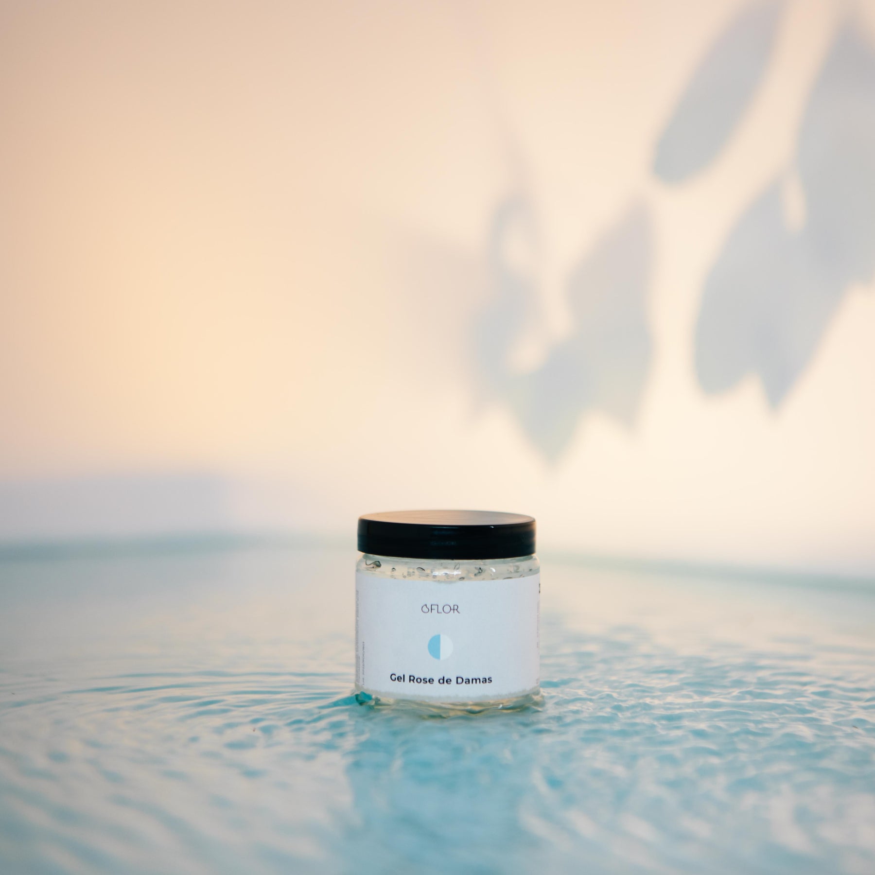 Gel d'hydrolat bi-distillé de fleur de Rose de Damas. Son parfum est très raffiné.